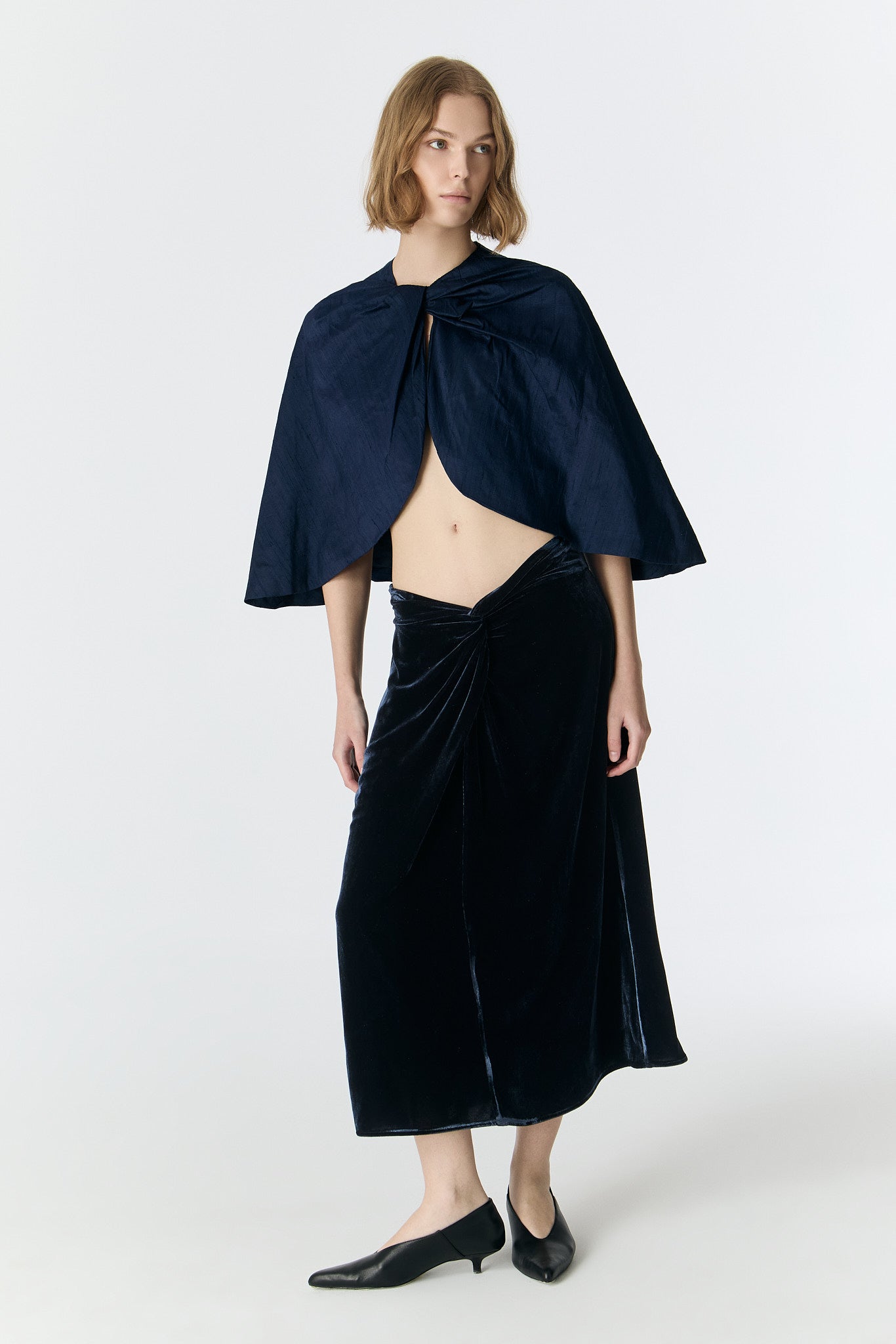 A house signature reintroduced this season in deep navy silk shantung. The Ayse Cape embodies the brand’s sculptural minimalism — defined by its clean, architectural drape and subtle luster that accentuates the texture of the fabric.