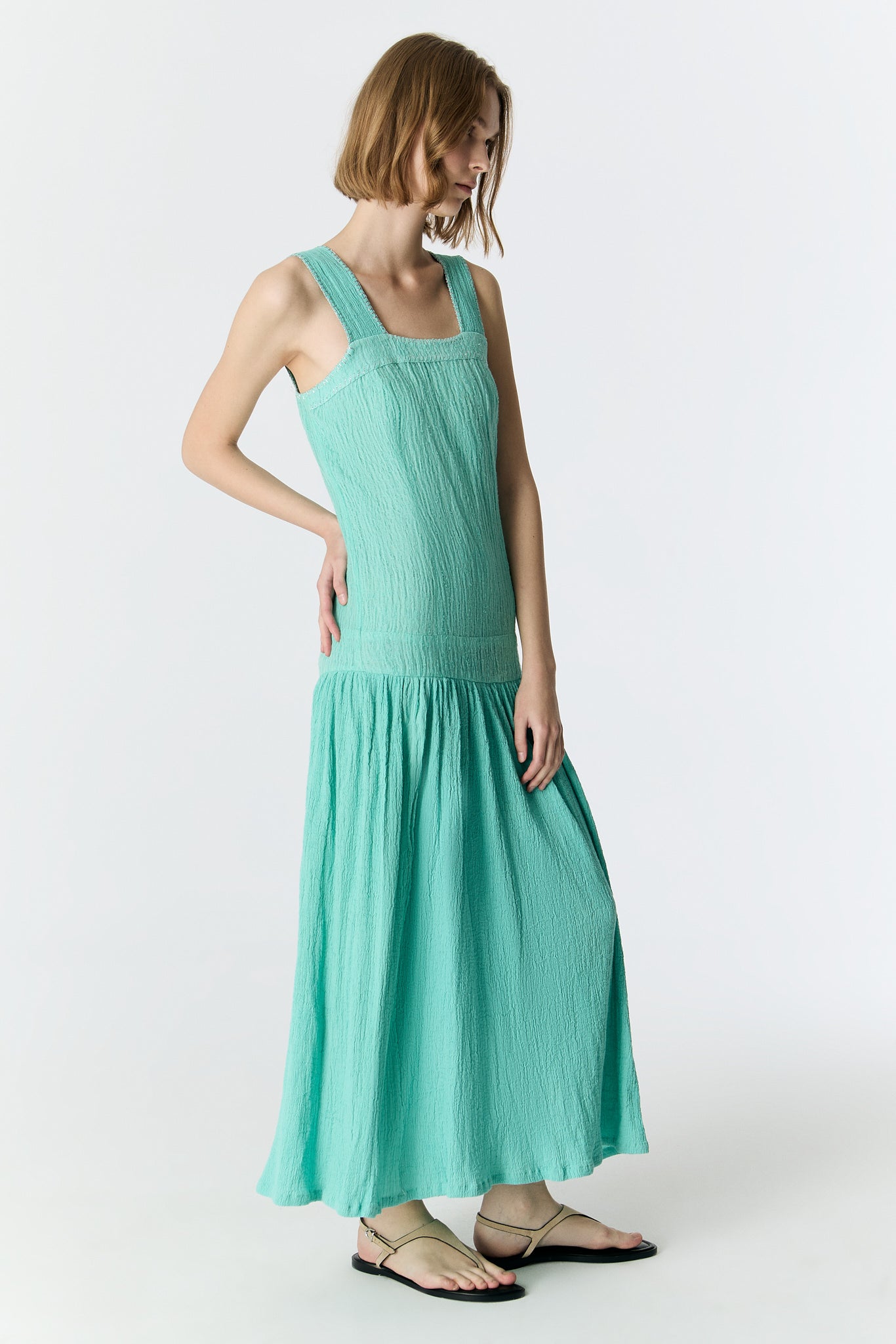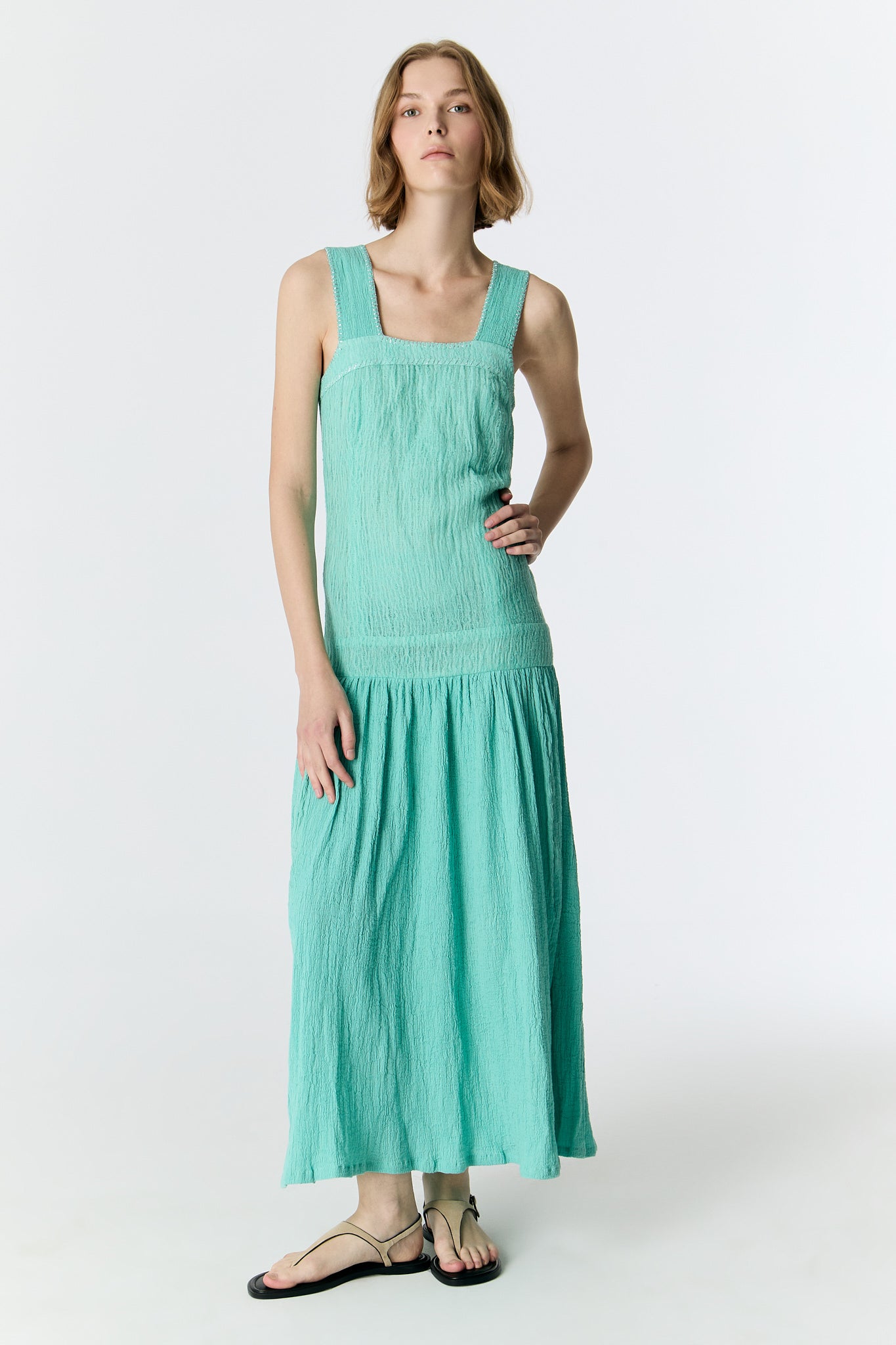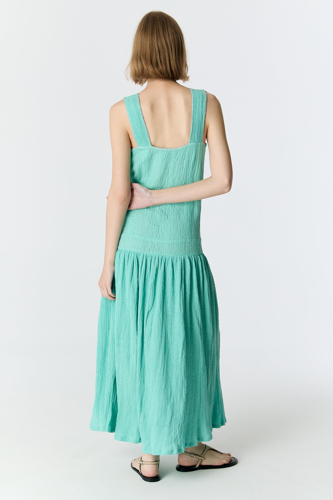 The square neckline and wide straps create a clean and balanced shape, while the softly gathered skirt introduces natural movement and volume. The neckline and straps are finished with delicate silver-toned crochet handwork, highlighting the artisanal character of the piece.