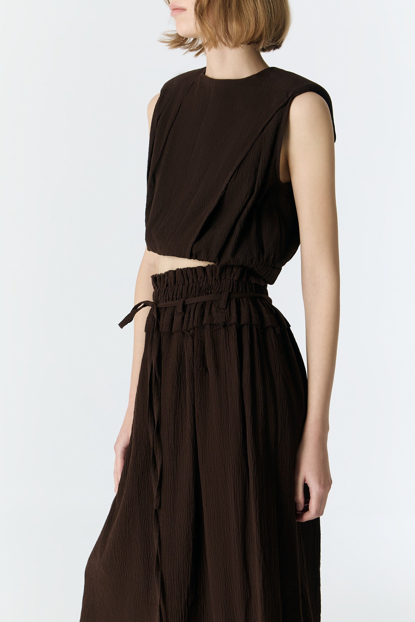 This top features padded shoulders, double pleats on one side, and is made from 100% crinkled cotton, with a button-up back.