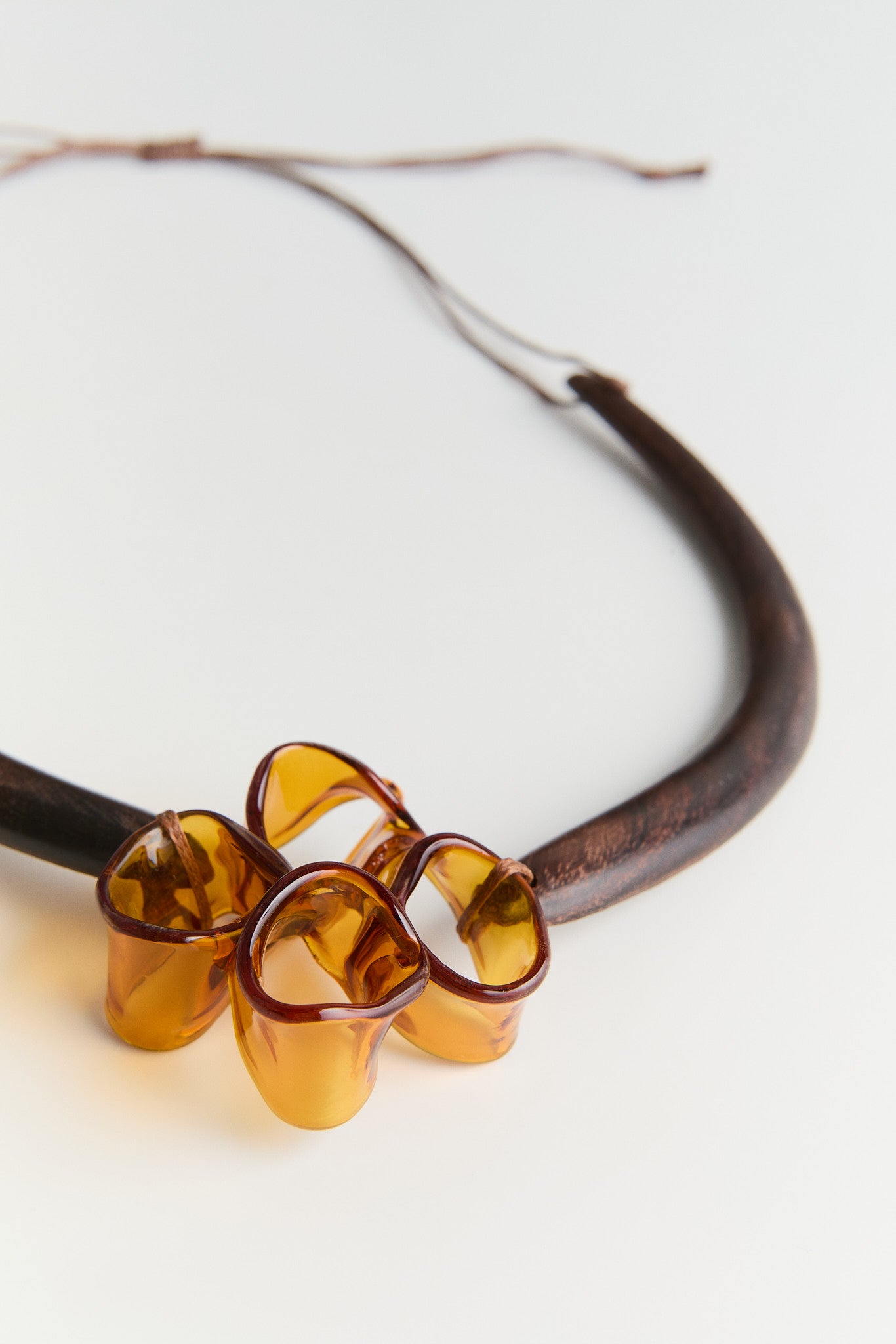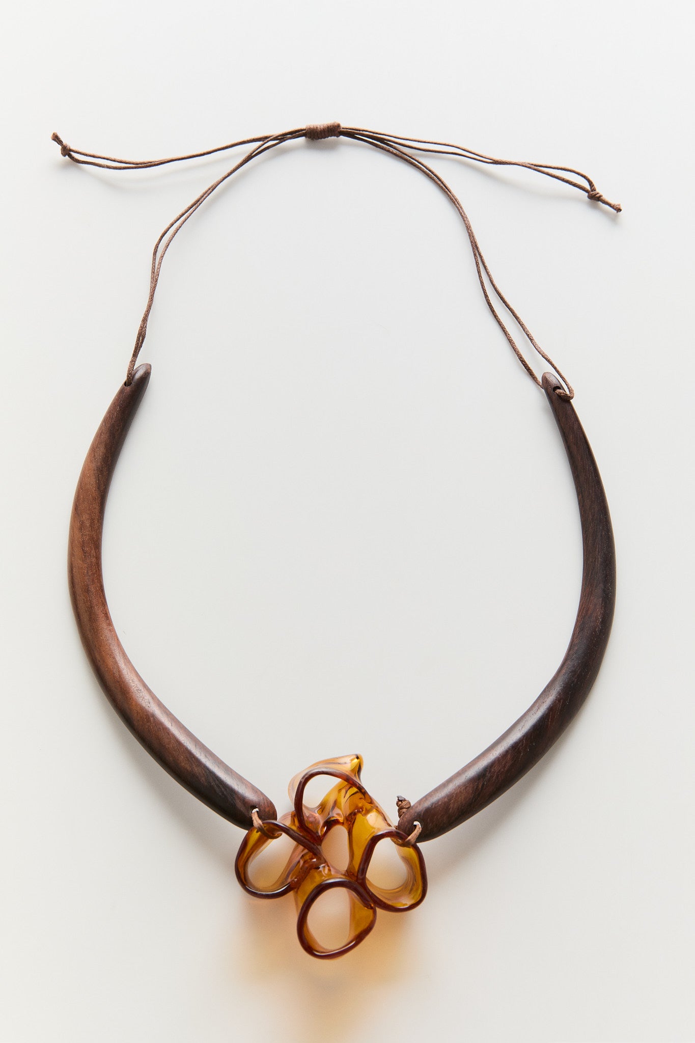 Open-flame shaped glass inspired by natural bloom formations. Paired with hand-carved ebony wood and finished with an adjustable cord. Each form is crafted in fire, kiln-annealed for strength, and assembled by hand.