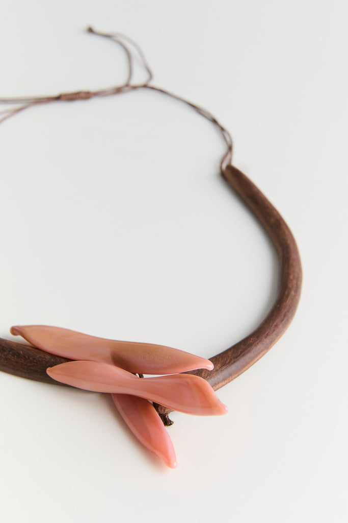 Each necklace features a hand-shaped Murano glass pendant mounted on a sculpted ebony stem, balancing transparency and weight in equal measure.