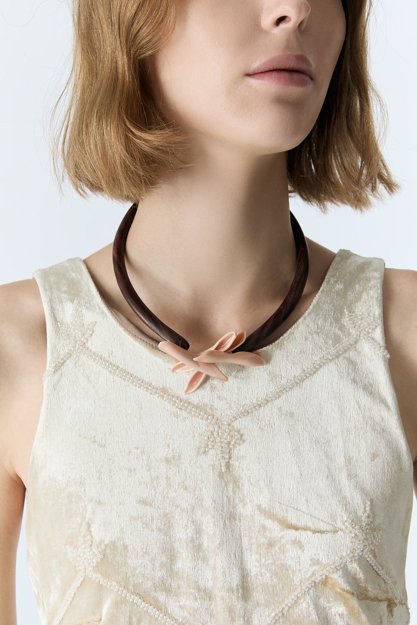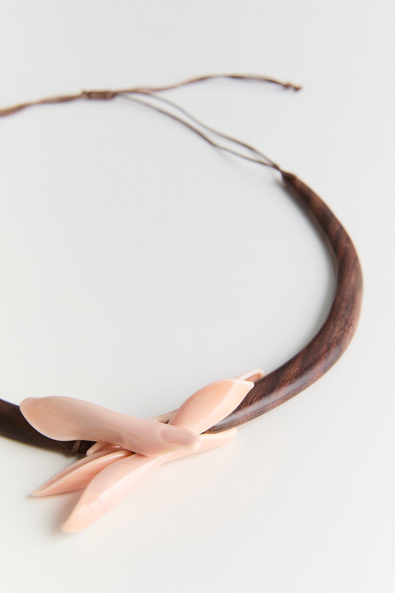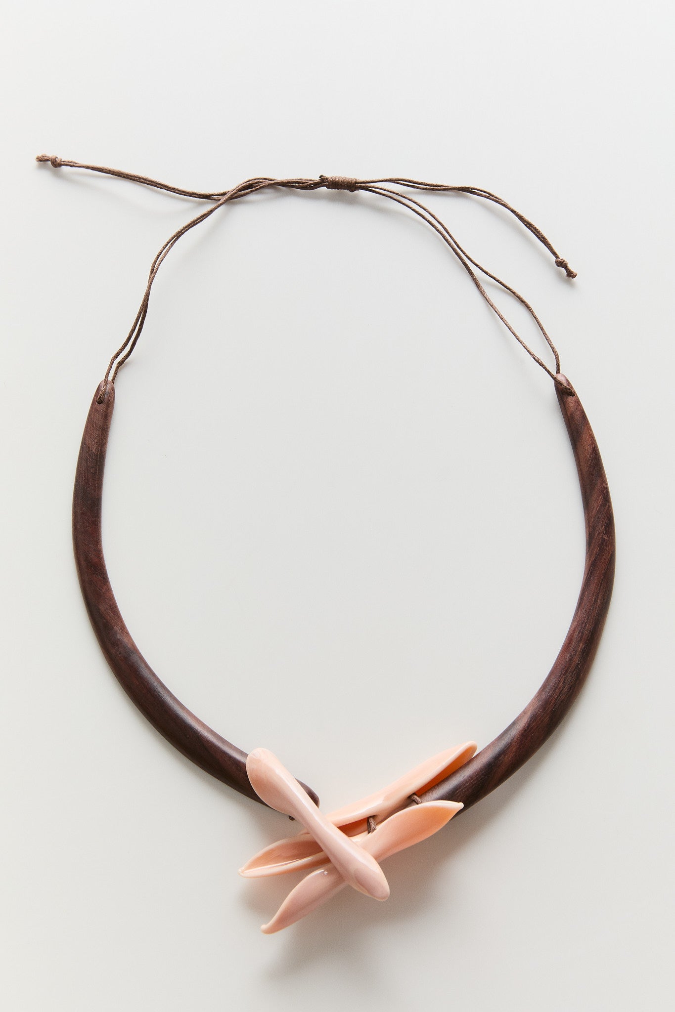 Each necklace features a hand-shaped Murano glass pendant mounted on a sculpted ebony stem, balancing transparency and weight in equal measure.